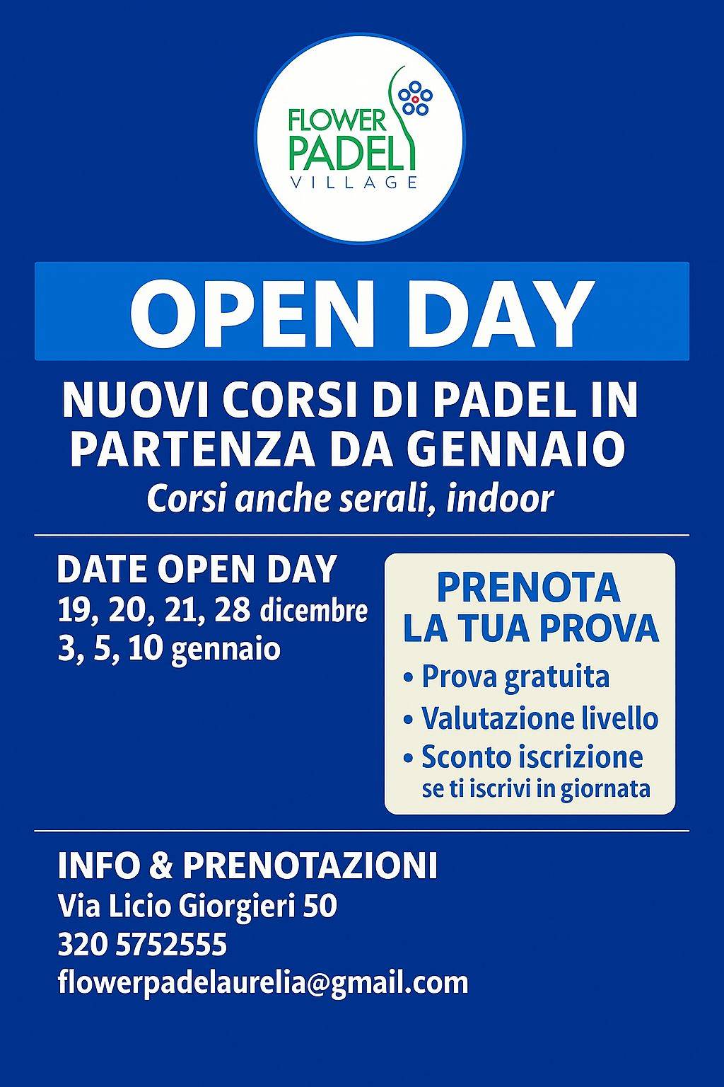 Per i nuovi corsi collettivi di padel che si svolgeranno a partire da gennaio sui nostri campi indoor e outdoor vi offriamo la possibilità di partecipare agli OPEN DAY che si terranno, previa prenotazione, durante le festività del Natale: il 19, 20, 21 e 28 dicembre 2025 e il 3, 5 e 10 gennaio 2026.